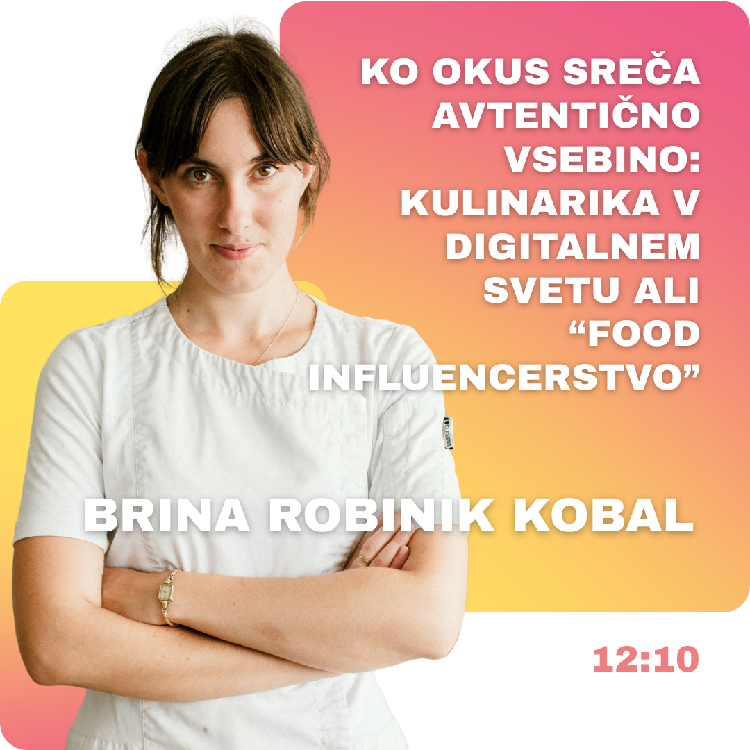 Brina Robinik Kobal je kulinarična ustvarjalka, ki hrano vidi kot zgodbo, izkušnjo in orodje povezovanja, s preprosto filozofijo: zaupaj vase, v svoje čute in v kakovost sestavin. Slovenska javnost jo pozna iz MasterChef Slovenija, kot zmagovalko MTikTok Chef Academy ter avtorico kuharske knjige za Oljarno Jeruzalem, danes pa svoje znanje deli tudi preko Odprte kuhinje, Instagrama, TikToka in delavnic. Na dogodku Dan_d bo spregovorila o food influencerstvu, o tem, kako nastajajo kulinarične vsebine ter zakaj nekatere zgodbe zaživijo, druge pa ne.
